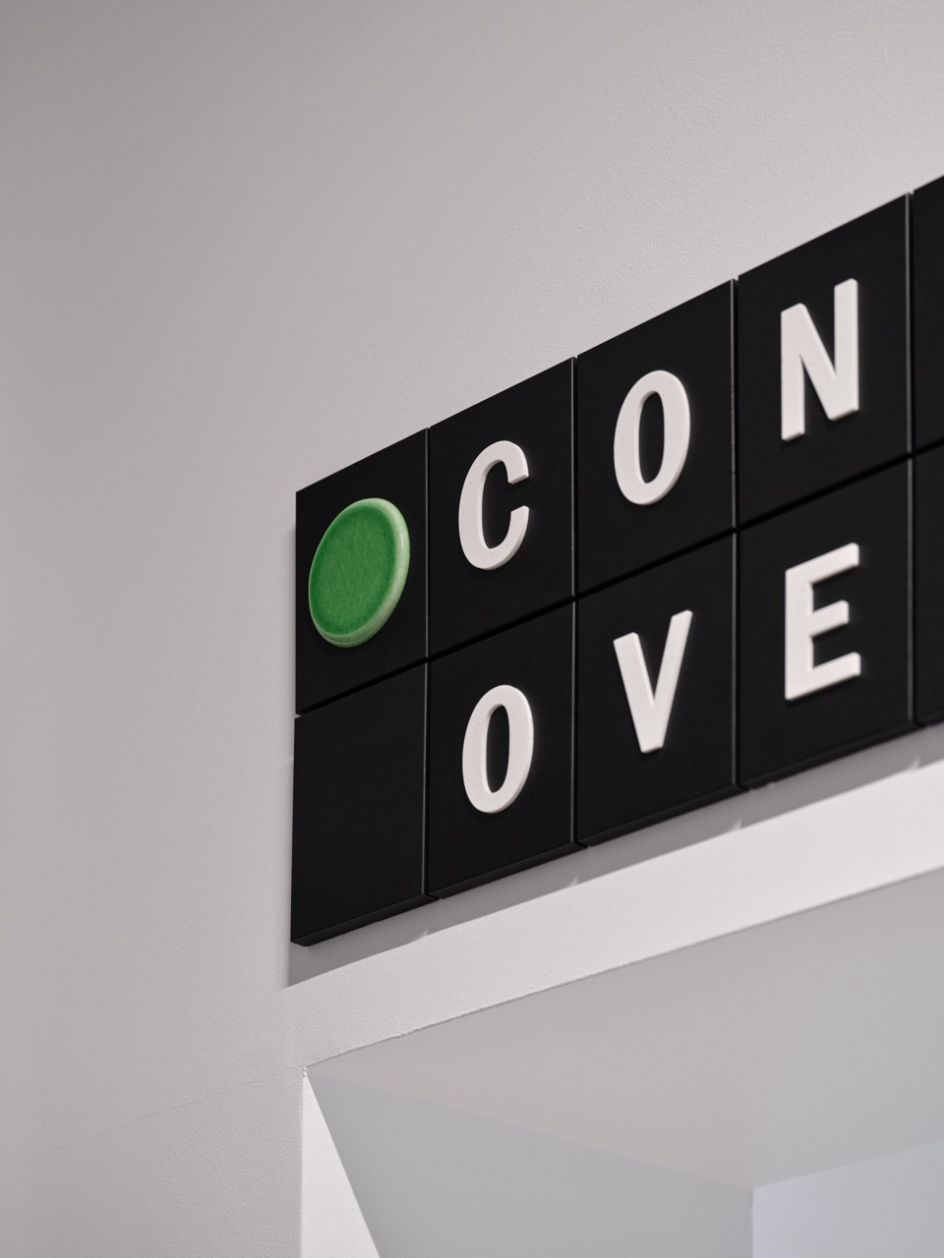 The material palette is a bricolage of recycled paper composites, tiles, aluminium cases, and letterforms made from post-consumer plastic. Even the jewel-like lava stone roundels – while admittedly the most carbon-intensive element – are small flourishes chosen for durability and impact.